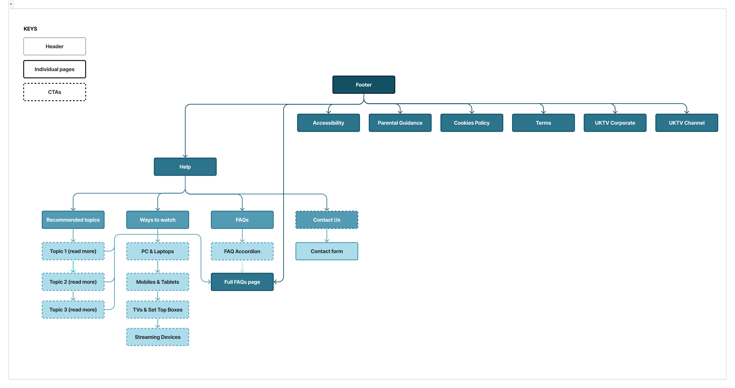 As part of UKTV Play’s rebrand, the objective was to enhance the platform's overall structure, making it more user-focused and relevant. One of the resulting decisions was to change how users access and use the help page. This change meant leveraging the existing mental modes of users and understanding how they typically seek information.