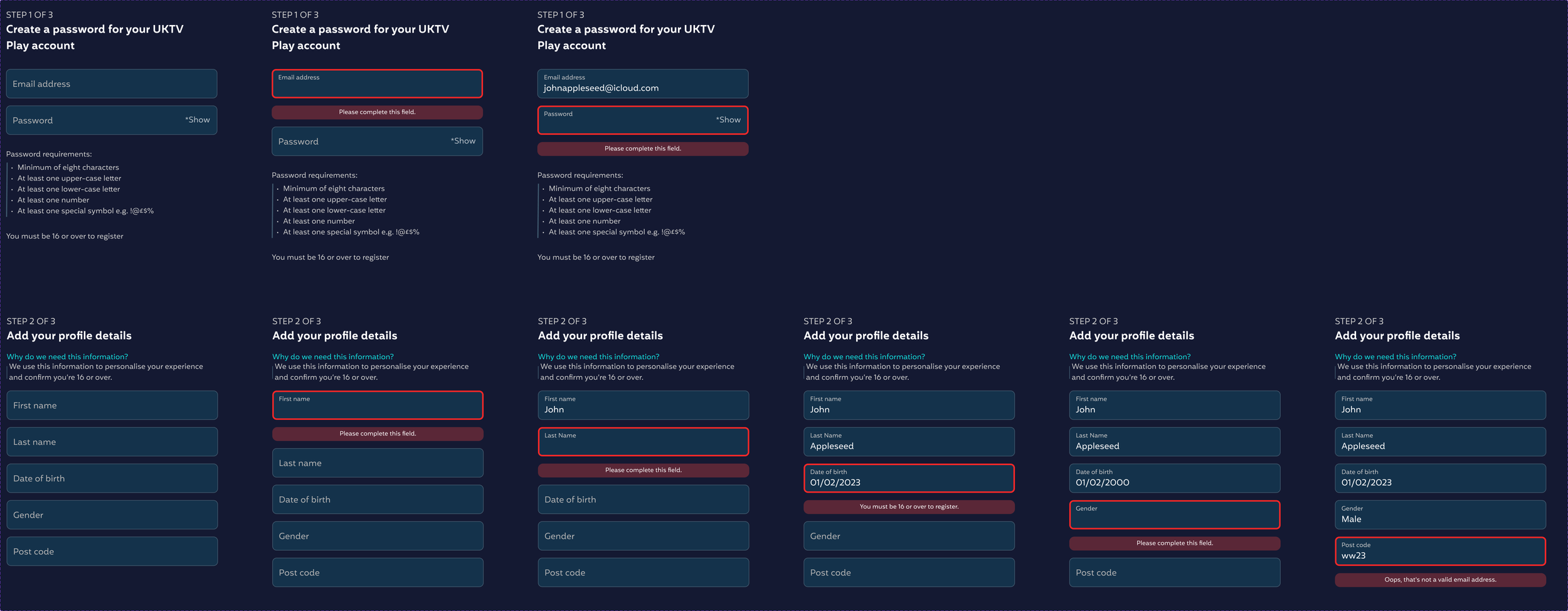As an advocate for ensuring consistency across all platforms for UKTV Play. I have taken the sign-in and registration process on the web into consideration and repurposed these designs, incorporating the opportunities discovered from the SWOT analysis, in order to brainstorm potential UI enhancements and establish a user flow for this journey.
