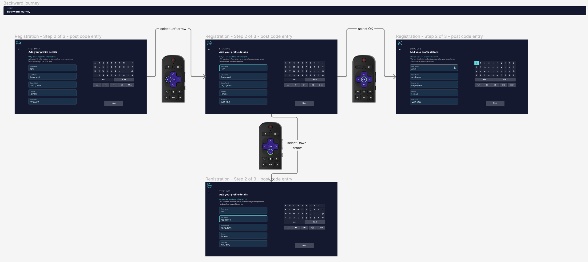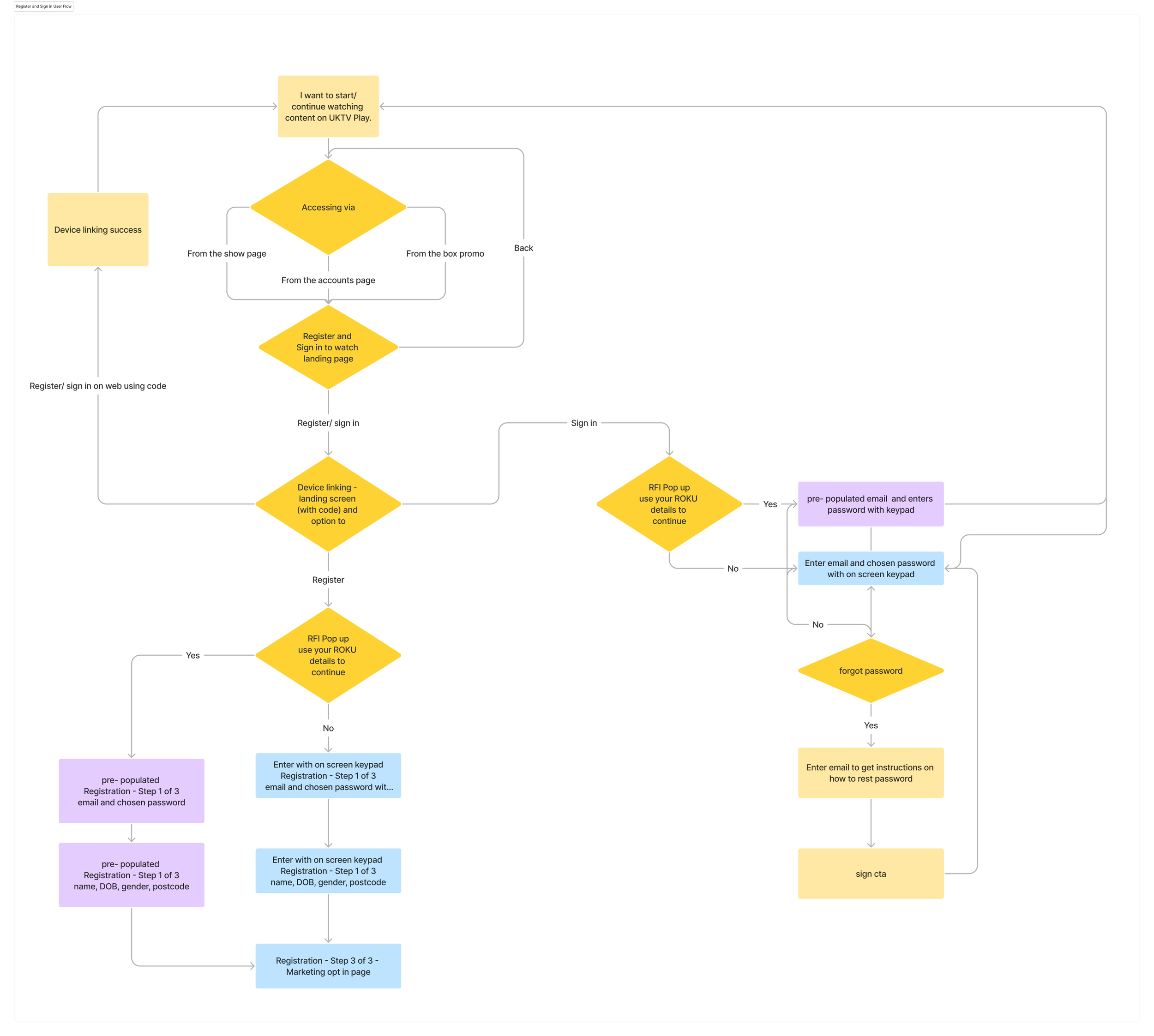 In order to design the optimal experience, the sign-in/registration journey needed to meet certain acceptance criteria. Some of these criteria include the inclusion of an RFI screen (Roku's request for information pop-up) where the user can consent to their credentials being used to create an account on UKTV Play. This screen allows Roku to pre-populate fields after the user gives consent on the RFI screen. The challenge in this situation was that I had to design for multiple scenarios while ensuring a smooth experience for the users.
